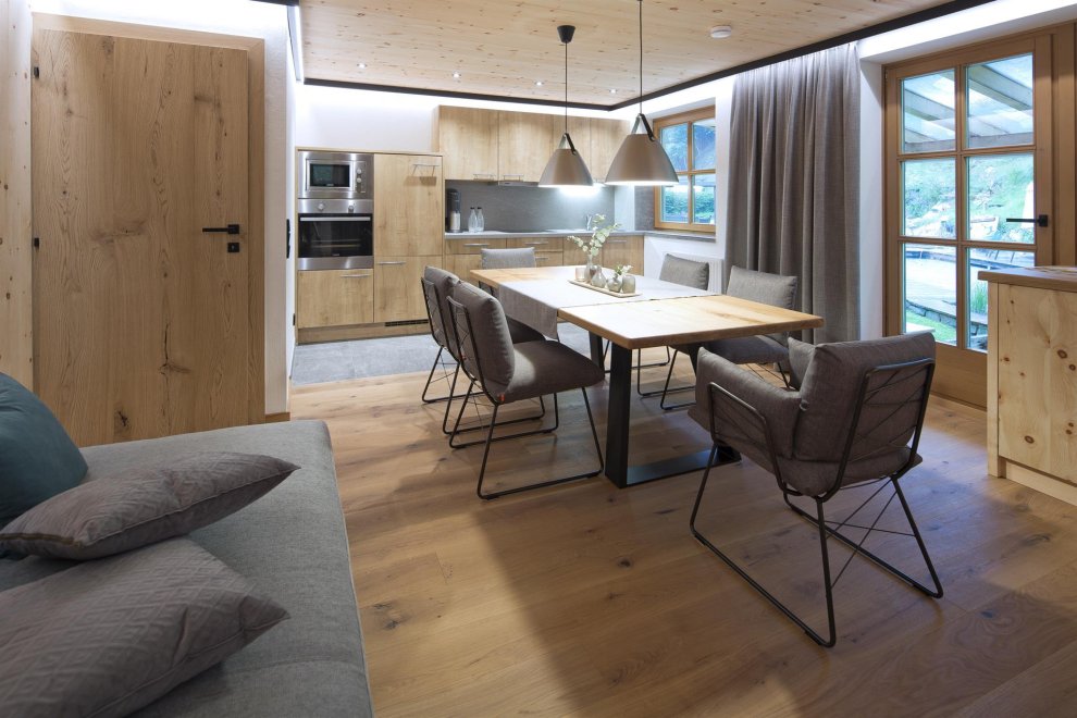 Ein Aufenthalt bei uns wird sie überzeugen. Unsere kleine grüne Oase mit Naturpool befindet sich im Dorfzentrum von Fieberbrunn, in sehr zentraler und dennoch ruhiger Lage - abseits von Lärm und Stress. Restaurants und Geschäfte sind zu Fuß erreichbar. Ihr Auto benötigen Sie nicht - Sie kommen bequem mit dem Bus-Shuttle (2 Gehminuten zur Bushaltestelle) ins Ski-und Wandergebiet. Drei Appartements im Parterre mit Terrasse, Sitzgelegenheit und direktem Ausgang in den Garten und zwei Appartements im ersten Stock mit großem Balkon und Sitzgelegenheit verströmen eine stimmige Atmosphäre im "Alpinen Chic". Ein erlesenes Interieur sorgt für die nötige dezente Eleganz mit qualitativ hochwertiger Einrichtung in Zirbe, Eiche und Fichte sowie edlen Stoffen. Unsere Dachterrasse mit 200 m² ist einfach und bequem mit dem Personenlift erreichbar. Dort genießt man die herrliche Aussicht über Fieberbrunn.