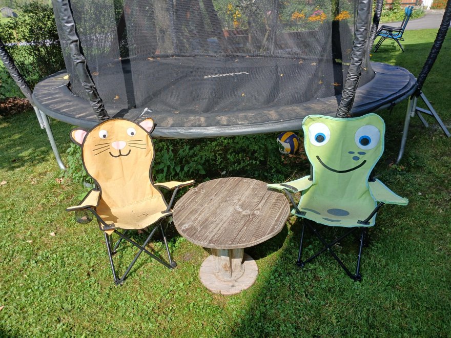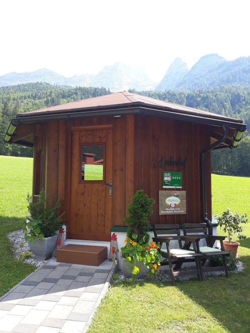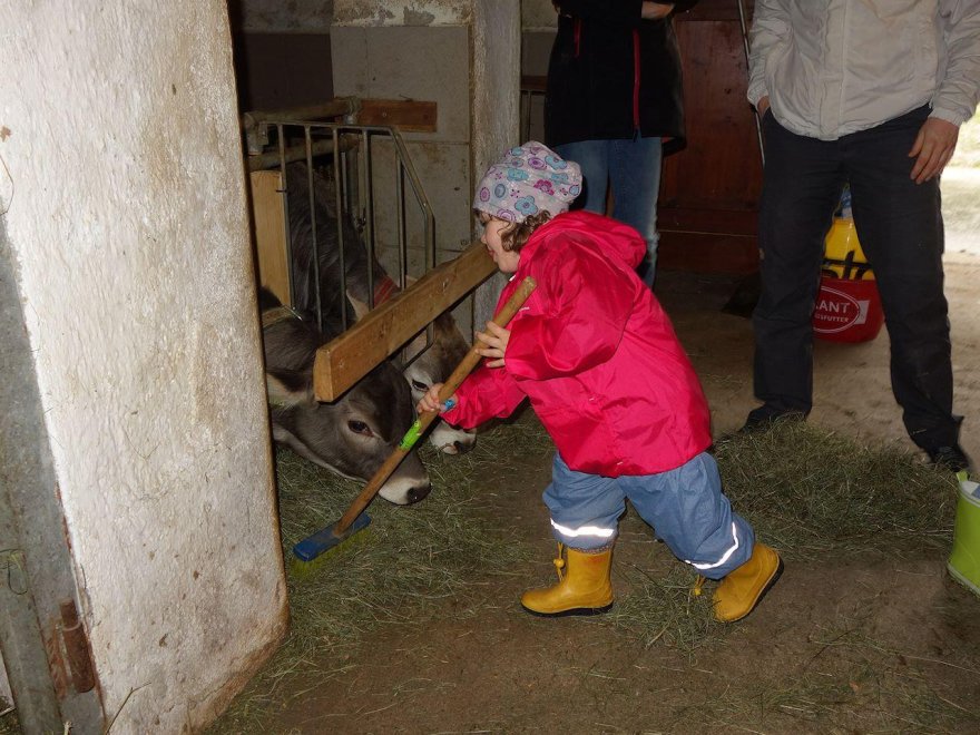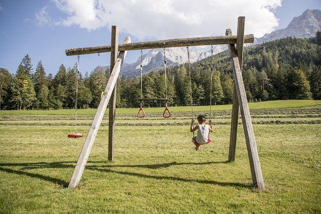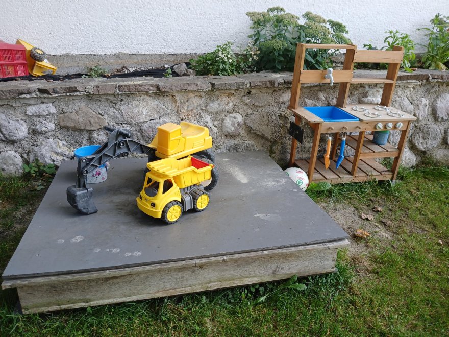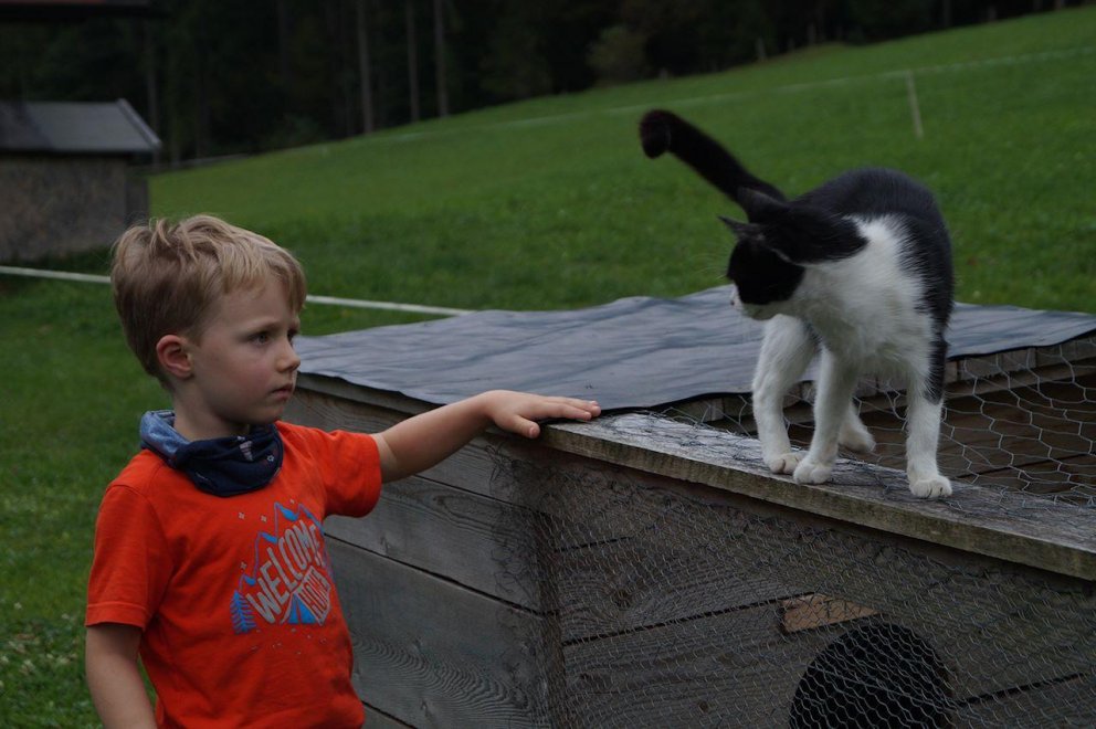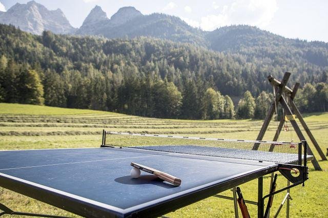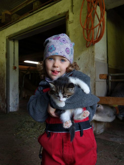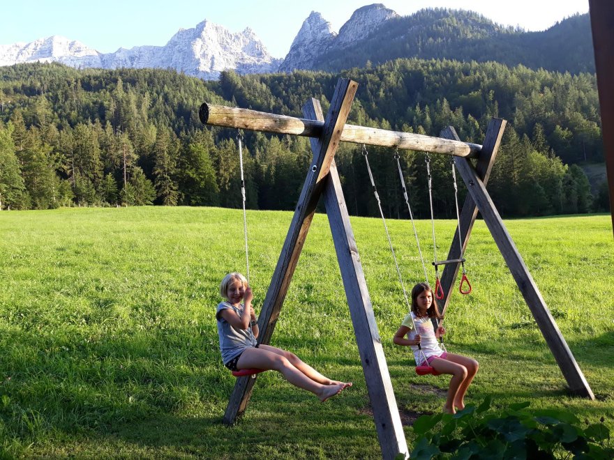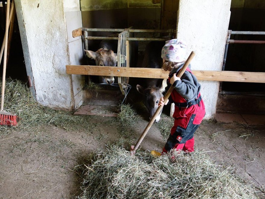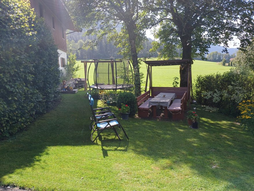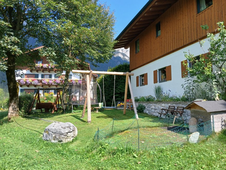 Kinderglück: Das Kinderlachen klingt leise vom Hof, es steht für die Kinder ein kleiner Spielplatz mit Schaukel, Sandkiste, 3m Trampolin, kleine Fahrzeuge, Slackline, Tischtennis und Winterrodelbahn zur Verfügung und die Kinder dürfen bei uns bei der Stallarbeit helfen und die Tiere streicheln.