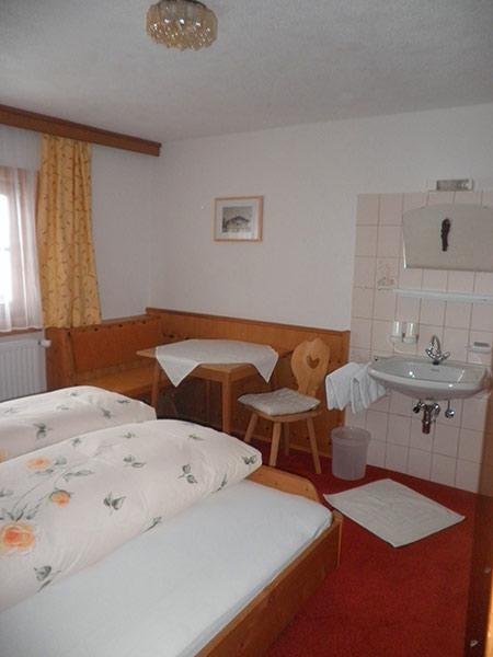 Geräumiges Zimmer mit 2 getrennten Betten, Tisch, Stühle, Schrank, Waschbecken, helle Holzmöblierung.