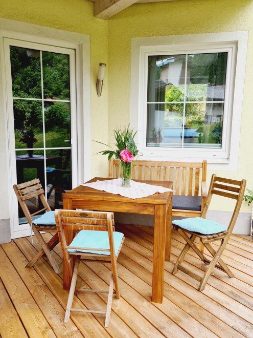 - Terrasse mit Gartenmöbeln und Gartenliegen