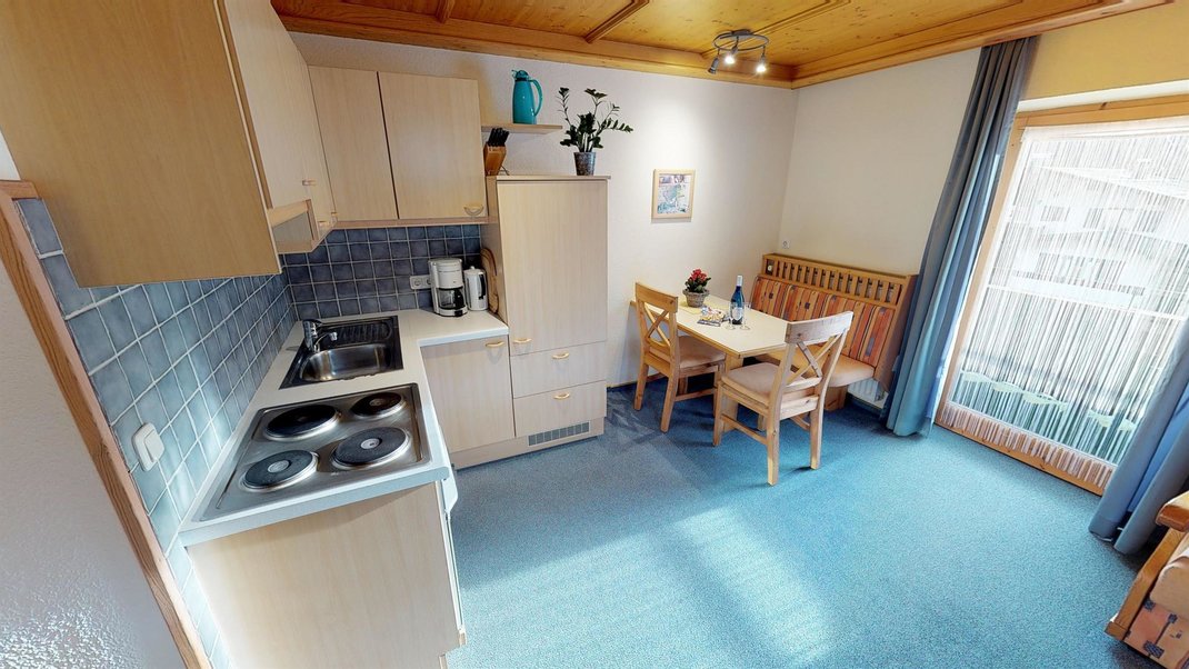 Es erwartet Sie ein gemütliches ca. 40m² Appartement für 2-3 Personen. Durch den Vorraum gelangen Sie auf den großzügigen Balkon mit traumhaften Ausblick. Die Küche ist liebevoll bestückt mit viel Inventar sowie einer gemütlichen Essecke. Das angrenzende Wohnzimmer verfügt über ein hochwertiges Schlafsofa, TV, Stereo-Anlage und vieles mehr. Im gemütlichen Schlafzimmer verfügen Sie über ein bequemes Doppelbett (180x200 cm). Modernes Badezimmer bestehend aus Dusche, Waschbecken und WC. 1 WC extra.
