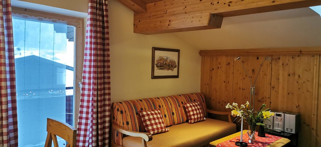 Gemütliches ca. 40m² großes Appartement für bis zu 3 Personen im obersten Stockwerk des Hauses. Hier verfügen Sie über einen Vorraum, Südbalkon mit Gartenmöbeln, 1 Schlafzimmer mit DU/WC und Fön, ein 2. WC, Küche mit viel Inventar, Mikrowelle, Kaffeepadmaschine und vieles mehr. Das Wohnzimmer ist mit einer hochwertigen Schlafcouch und TV, Stereoanlage mit CD-Player und mehr ausgestattet. Die Wohnung ist durch das Doppelzimmer Rothorn für insgesamt 5 Personen erweiterbar.