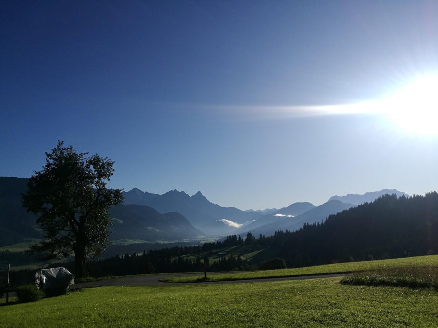 Grandiose Ausblicke auf das Kitzbüheler Horn, Wilder Kaiser, Loferer & Leoganger Steinberge. Skizirkus Fieberbrunn/Saalbach 15 Minuten entfernt. Ideal zum Wandern, Entspannen, Skitouren und Mountainbiken. Gemütliche helle Wohnung mit grandiosen Blicken auf die Berge und direktem Zugang zum Garten. Grillmöglichkeit im Garten. Großzügige Wohnküche, Bad mit Dusche und Badewanne. 2 Schlafzimmer. Keller mit Skiständer. Fussbodenheizung. Wir haben ganz bewusst keinen Fernseher in der Wohnung - geniesst die Ruhe und die schöne Aussicht! Wir verzichten ausserdem auf eine Kapsel-Kaffeemaschine um Müll zu vermeiden. Es gibt eine French Press und eine italienische Espresso Maschine und auch sonst ist die Küche voll ausgestattet.