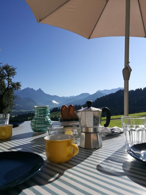Grandiose Ausblicke auf das Kitzbüheler Horn, Wilder Kaiser, Loferer & Leoganger Steinberge. Skizirkus Fieberbrunn/Saalbach 15 Minuten entfernt. Ideal zum Wandern, Entspannen, Skitouren und Mountainbiken. Gemütliche helle Wohnung mit grandiosen Blicken auf die Berge und direktem Zugang zum Garten. Grillmöglichkeit im Garten. Großzügige Wohnküche, Bad mit Dusche und Badewanne. 2 Schlafzimmer. Keller mit Skiständer. Fussbodenheizung. Wir haben ganz bewusst keinen Fernseher in der Wohnung - geniesst die Ruhe und die schöne Aussicht! Wir verzichten ausserdem auf eine Kapsel-Kaffeemaschine um Müll zu vermeiden. Es gibt eine French Press und eine italienische Espresso Maschine und auch sonst ist die Küche voll ausgestattet.