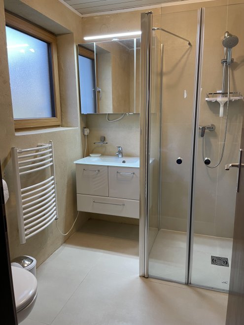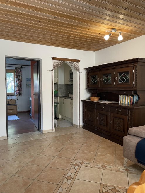 Ebenerdige Wohnung für 2 Personen mit Schlafzimmer, Wohnzimmer mit großer Schlafcouch, Kochnische, DU/WC (Zugang direkt vom Schlafzimmer). Ca. 42 m². Mehrere Terassen (frei und überdacht)