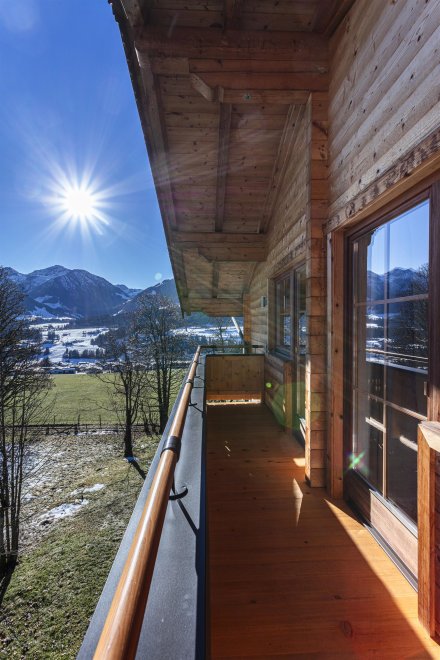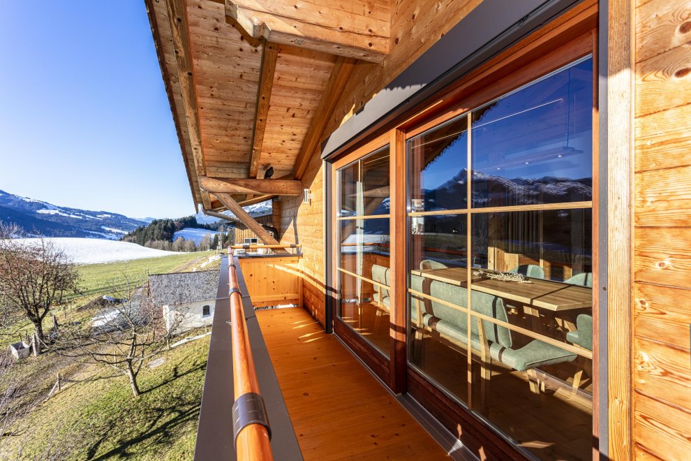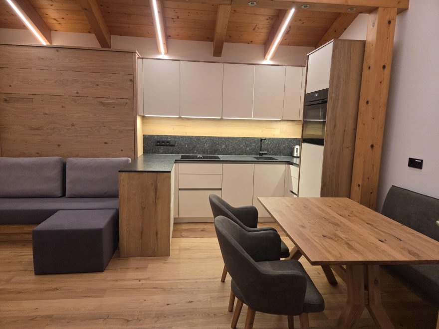 Der offene Wohn- und Essbereich mit moderner Küche bietet viel Platz zum Wohlfühlen. Eine Couch mit Bettfunktion (Lattenrost und Matratze) sorgt für zusätzlichen Schlafkomfort. Vom Wohnbereich aus gelangen Sie direkt auf den Balkon mit traumhaftem Panoramablick über die umliegende Bergwelt.