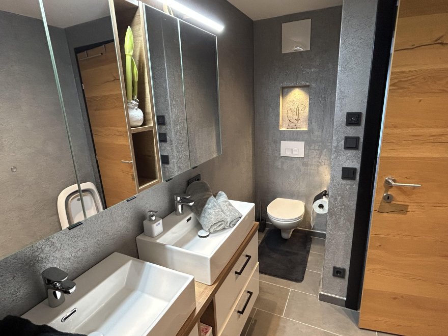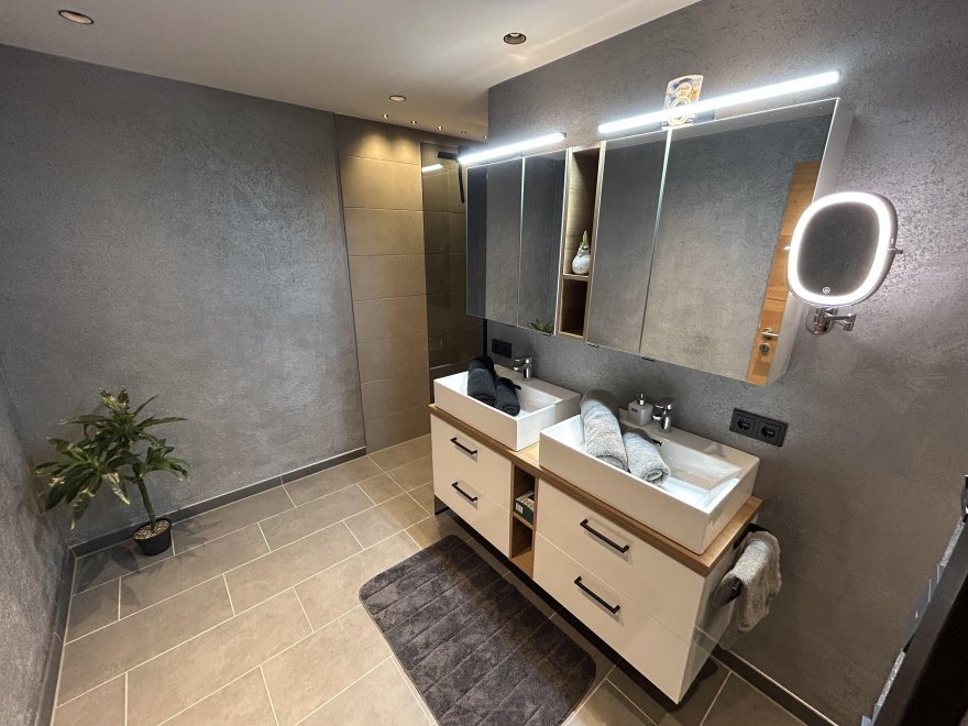 - Badezimmer mit Hand-/Duschtüchern, Föhn, Schminkspiegel.