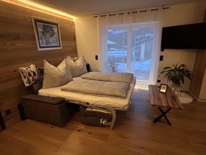 Wohn-/Schlafbereich mit Ausziehcouch (170x200) und Doppelbett (180x200), getrennt durch eine Holztrennwand. Safe vorhanden.