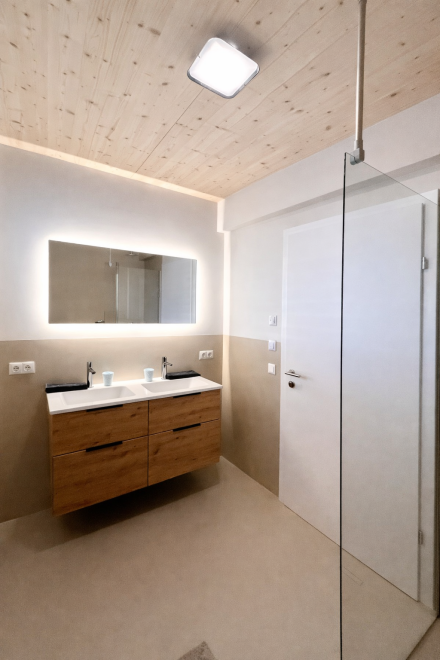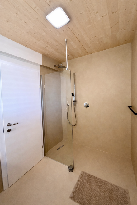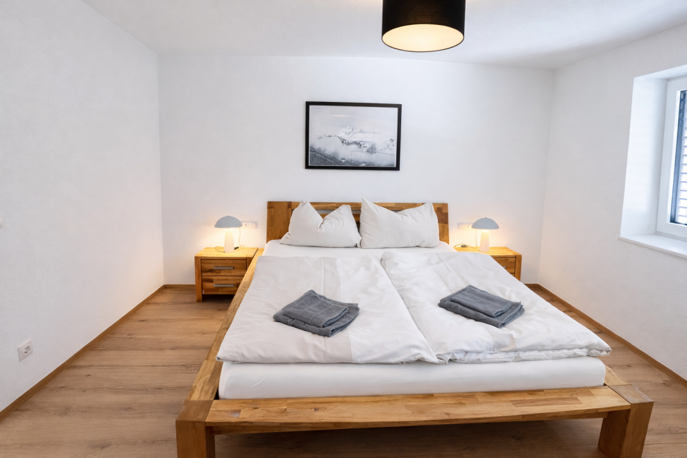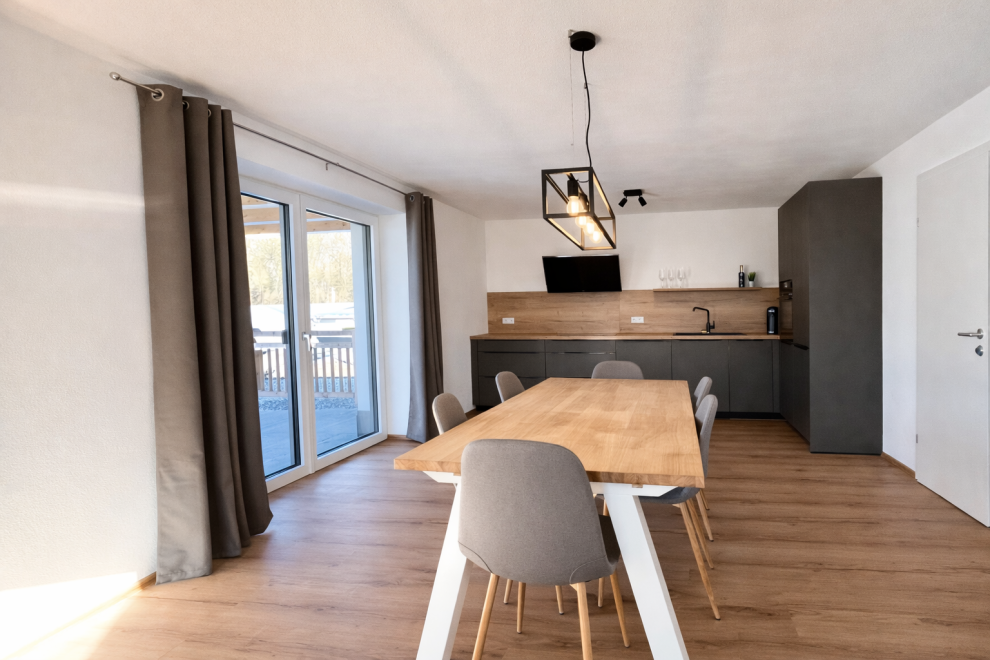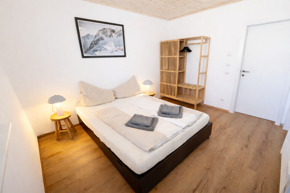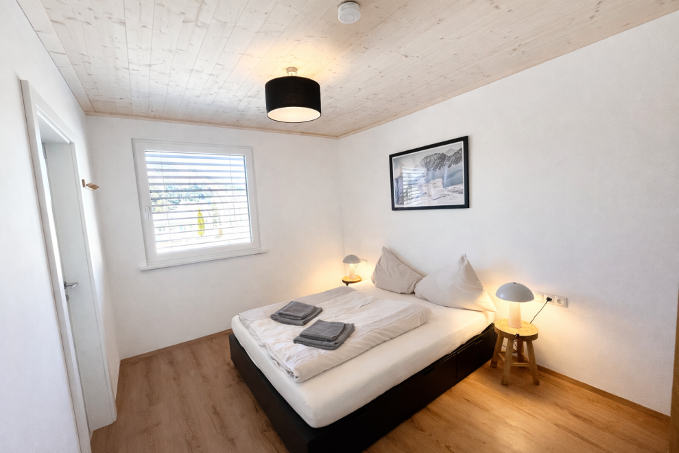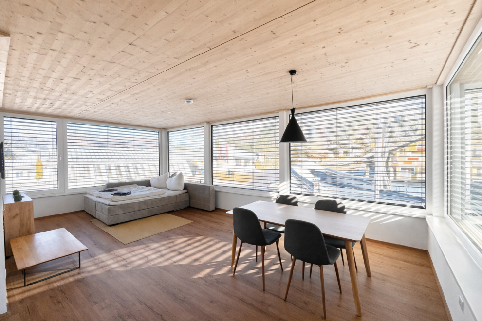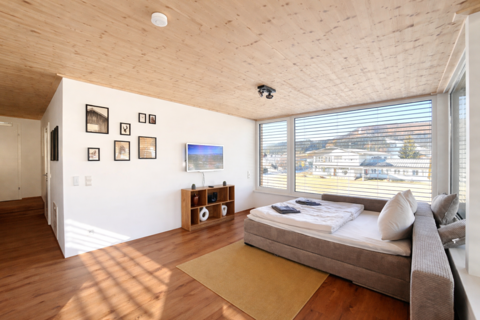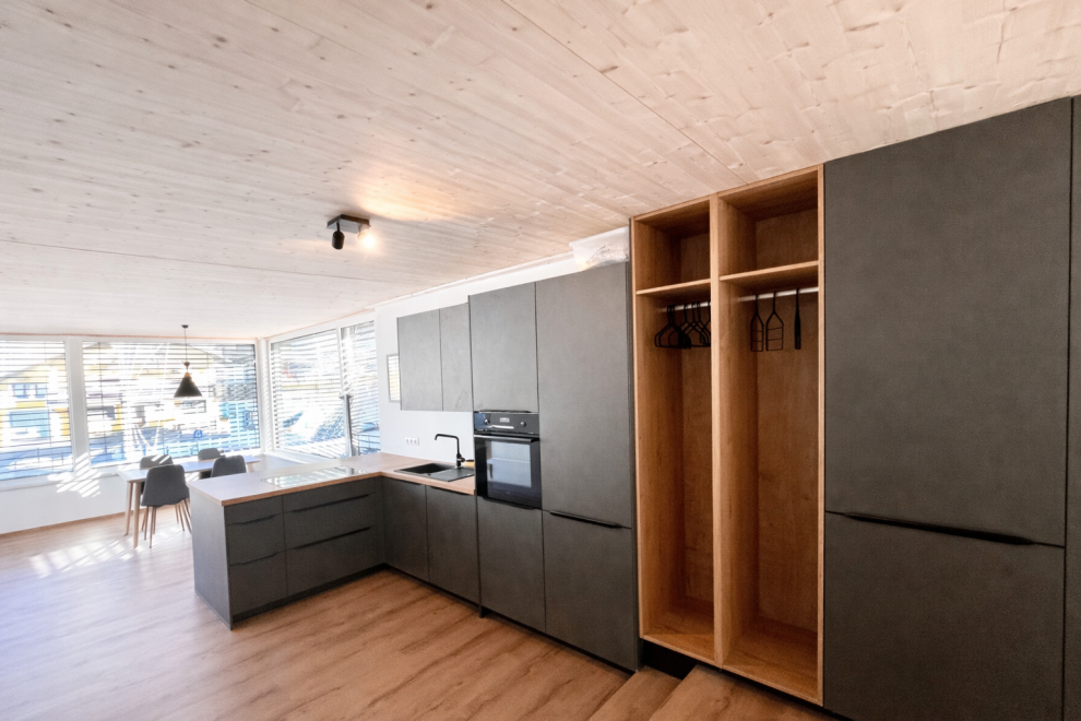 Auf rund 60 m² Wohnfläche bietet das Apartment viel Raum zum Wohlfühlen. Ein separates Schlafzimmer sowie eine großzügige Wohnküche sorgen für eine angenehme Raumaufteilung – ideal zum Entspannen, Kochen und gemeinsamen Verweilen. Große Panoramafenster holen die umliegende Bergwelt direkt ins Apartment und schaffen eine helle, offene Atmosphäre. Ergänzt wird der Wohnbereich durch ein Naturholzdeck, das mit seinen natürlichen Materialien für Wärme und Behaglichkeit sorgt.