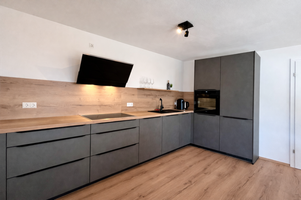 Der offene Wohnbereich mit Küche lädt zum gemeinsamen Kochen, Essen und Zusammensitzen ein. Große Fenster sorgen für viel Tageslicht und einen schönen Blick auf das Spielberghorn, das die alpine Umgebung prägt.