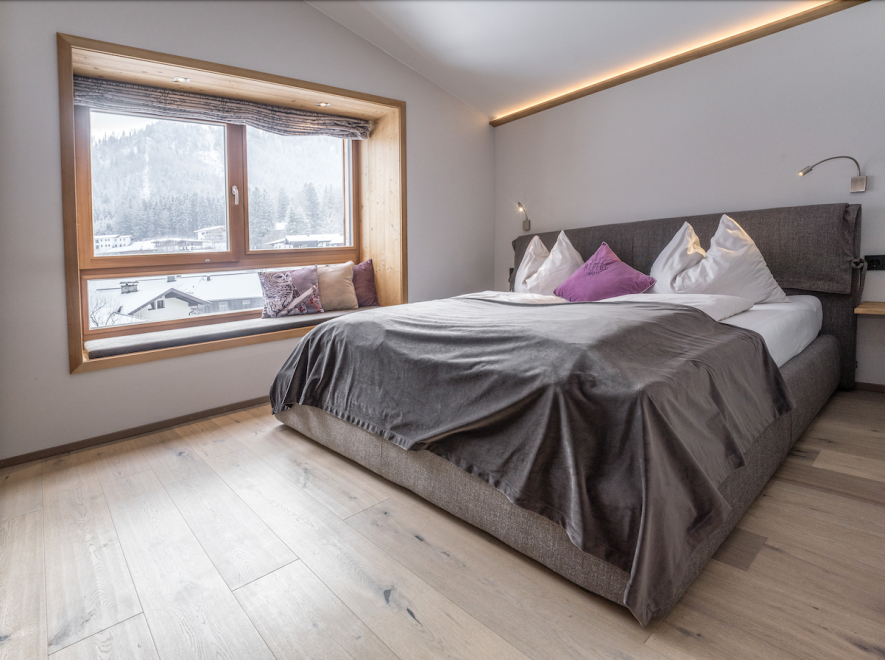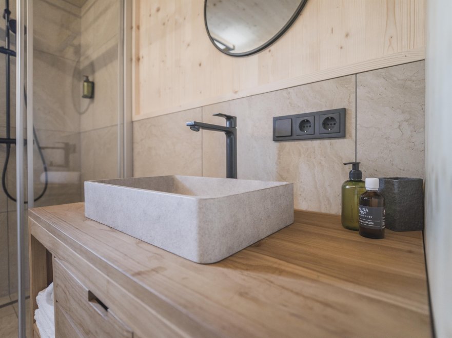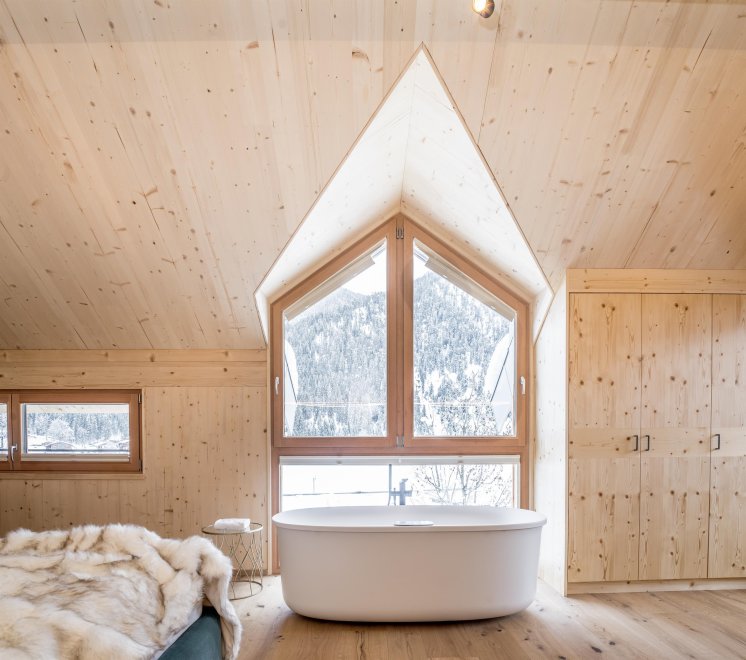 Experience ultimate luxury in our new chalet, where every detail has been designed for maximum comfort. Enjoy an exclusive bathing experience in the free-standing Jacuzzi Swirlpool® by the window while admiring the impressive mountain views. Relax in our outdoor balcony sauna with a view of the southern peak of the Watzmann. The bedroom becomes your personal spa with a glass rain shower. In the living area, the open fire creates a cosy atmosphere, while the window seat at the dining table offers a picturesque view. Immerse yourself in a world of luxury with a chalet that promises an unrivalled stay thanks to its extravagant design.