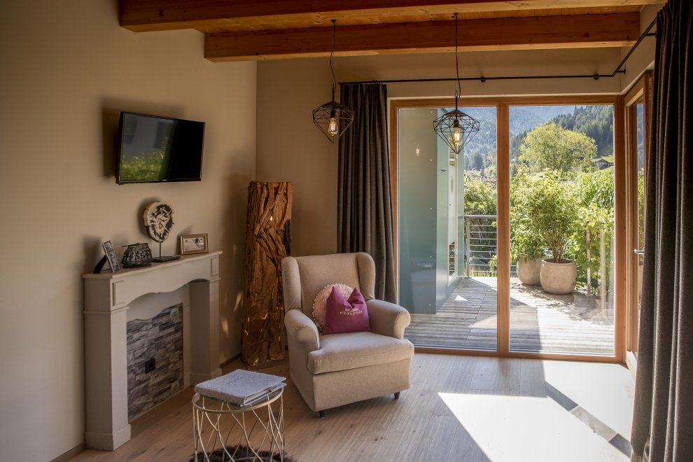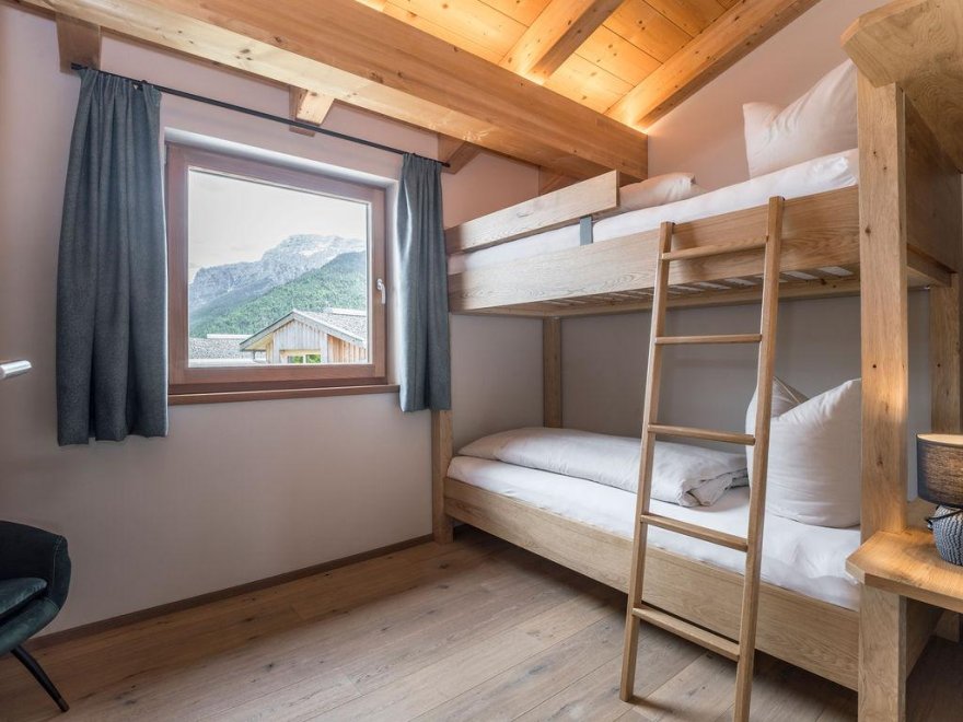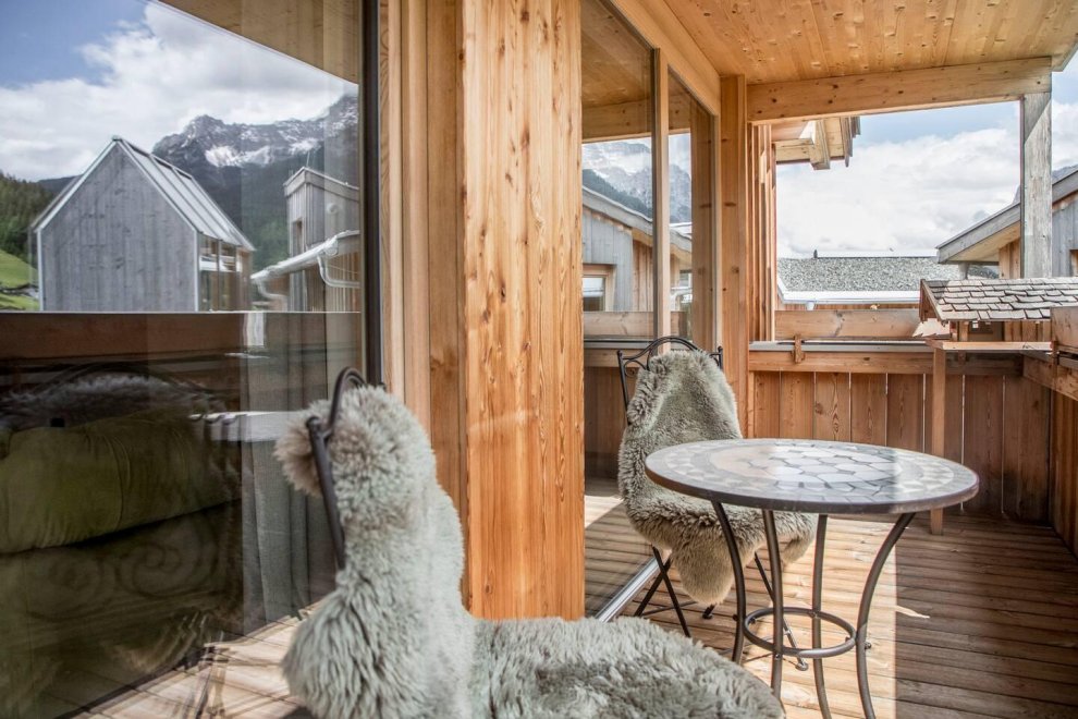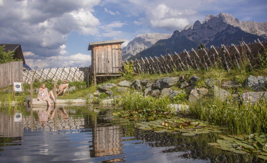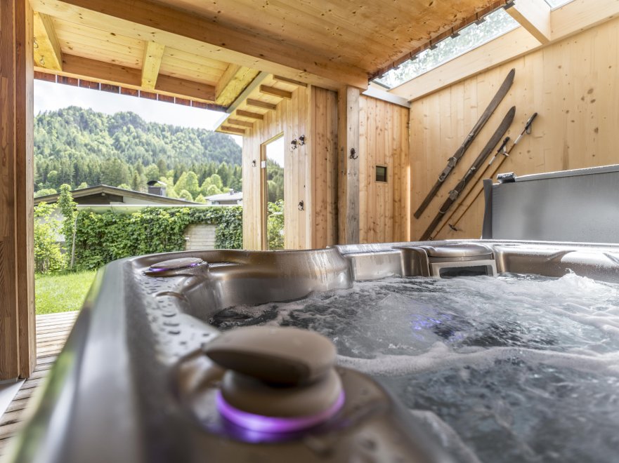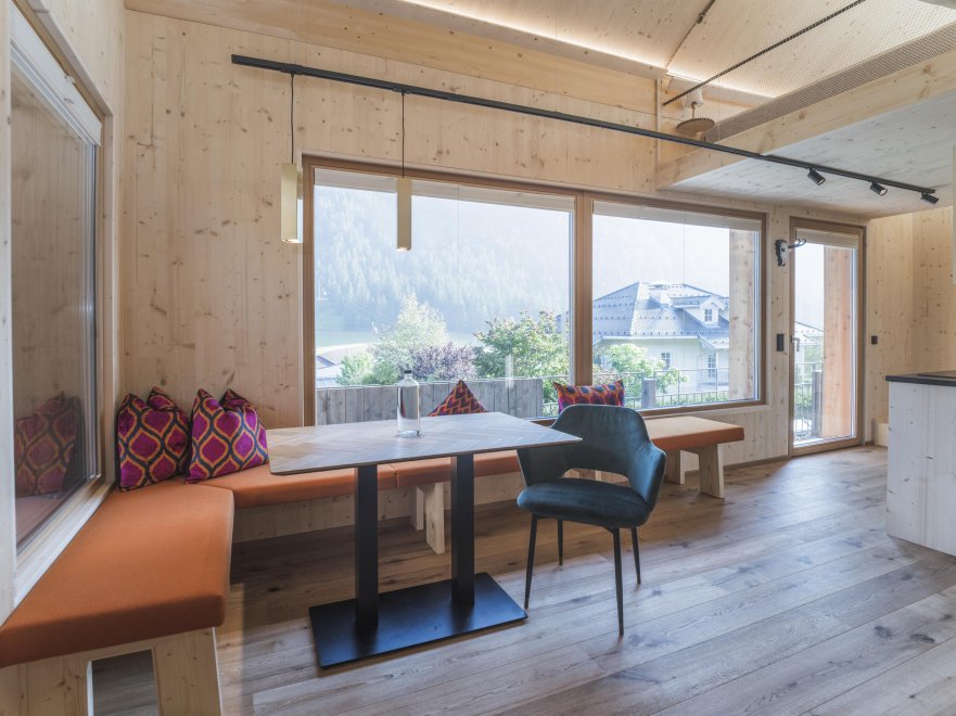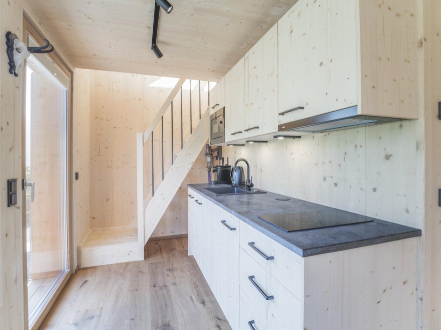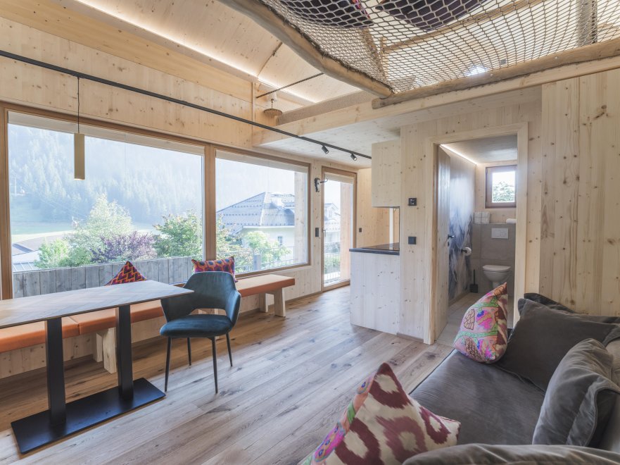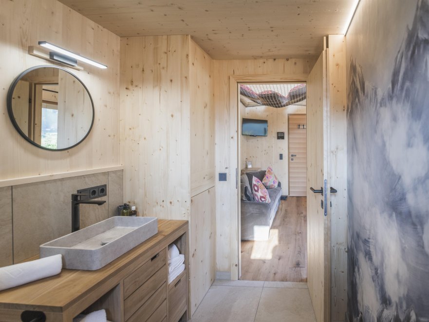 Ideal for solo travelers or couples with a small child, it offers a living and sleeping area, small kitchen, bathroom, private sauna, and wooden hot tub (36 °C). The rope suspension bridge in the sleeping area invites you to chill out, and the window seat in the dining area provides a wonderful view of the Steinplatte. Quiet, nature-oriented location – perfect for relaxation, unwinding, and small outdoor adventures in the mountains.