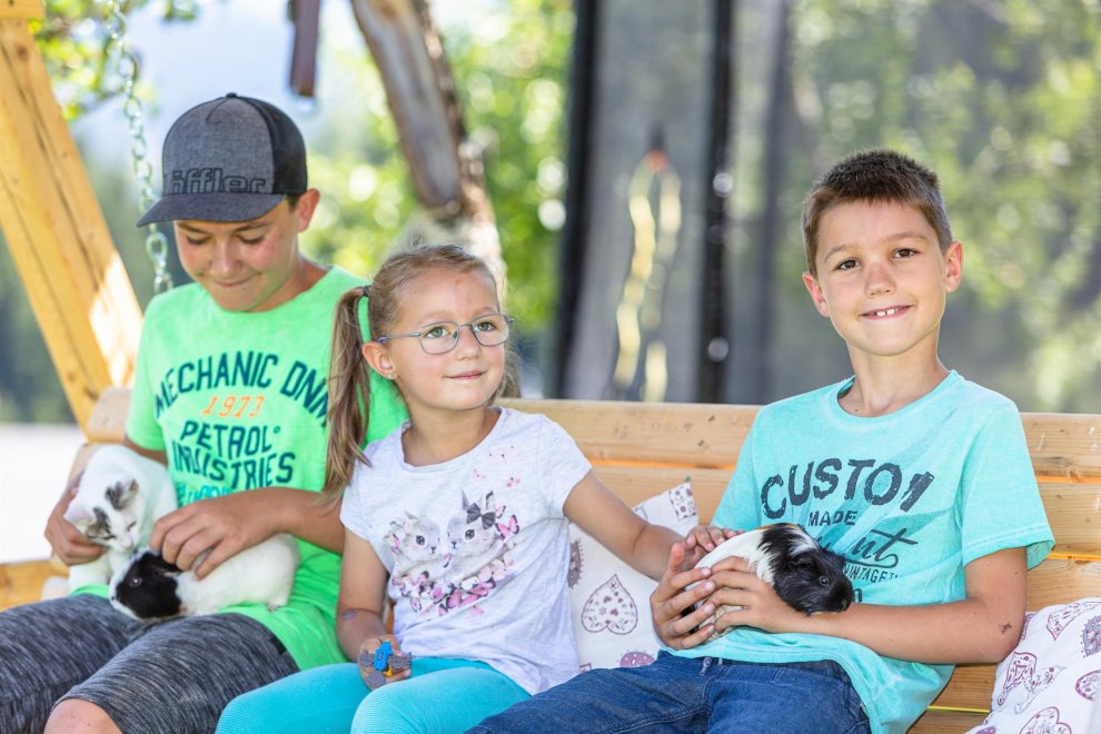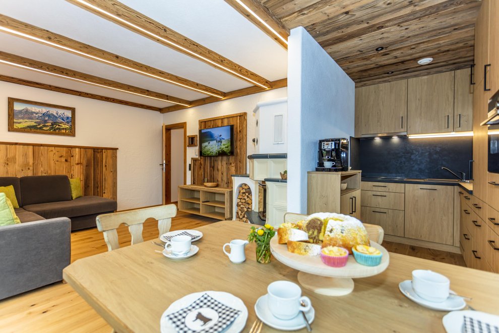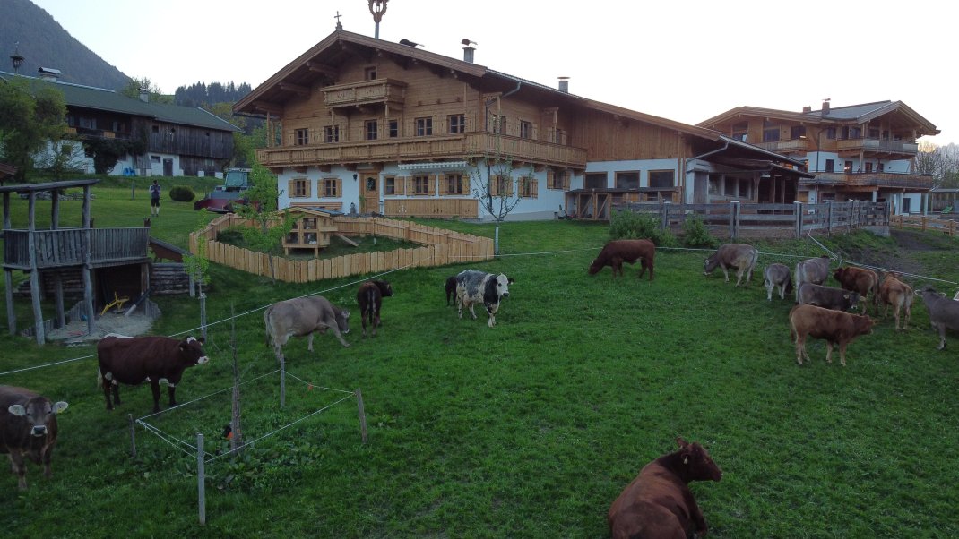 Our holiday apartments are located in a breathtakingly peaceful setting with panoramic views of the unique mountain scenery. Ideal for families, hiking enthusiasts, and snow lovers. There are many surprises for our little guests on our organic farm. Mini pigs, ducks, chickens, sheep, cats, and cows with their calves, a play and climbing tower with a sandpit and mud kitchen, swings, slides, and a trampoline, play tractors with trailers, Bobby cars, tricycles, a table tennis table, scooters, and much more. Enjoy our large sun terrace with barbecue, hanging chairs, and sun loungers. In winter, the surrounding slopes invite you for sledding and snowball fights. Right next to our holiday apartments is the cross-country ski trail, the toboggan run is just a 10-minute walk away, and the Fieberbrunn mountain lifts can be reached in just 5 minutes by car.