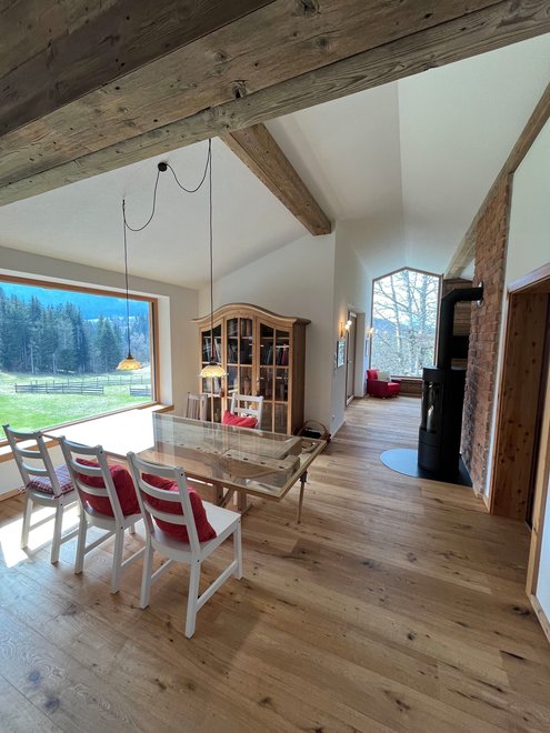 The Remise Reitl welcomes you with exclusive comfort and many lovely details. A large kitchen with a nearby dining area is connected to the living room with a large sofa and a woodstove with a glass window. Furthermore, there is a bedroom with a double bed, a children’s room with a loft bed, a large bathroom with a rain-shower as well as a second restroom.