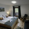 Room with double-bed, table, chairs, partly TV and badcony, shower/WC.