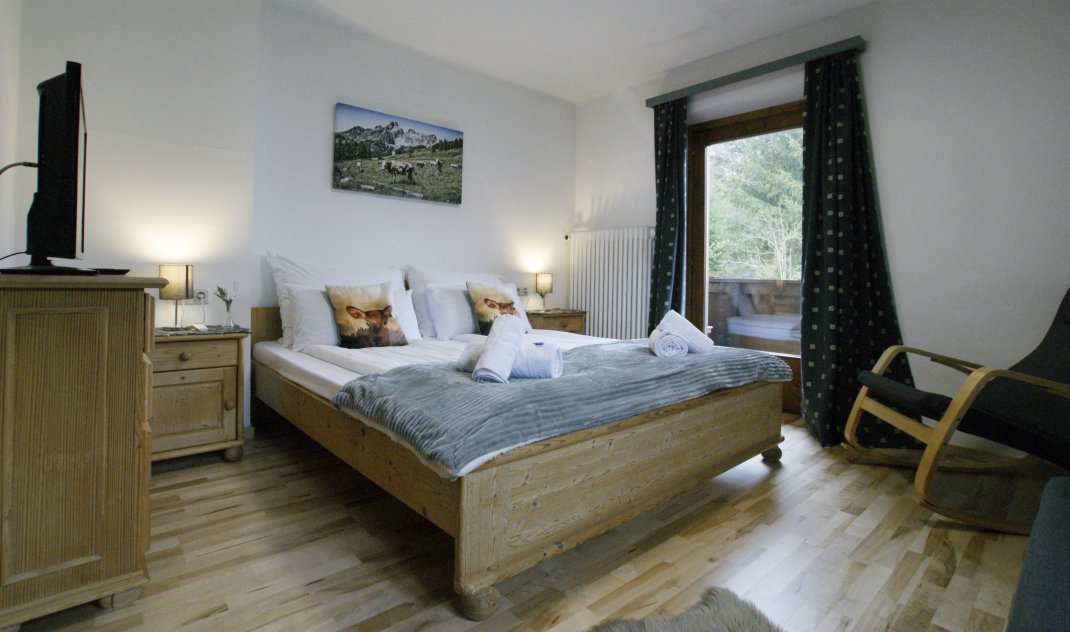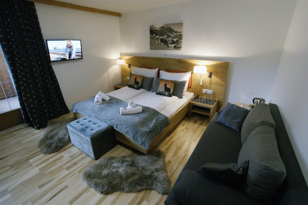 Room with double-bed, table, chairs, partly TV and balcony, shower/WC.