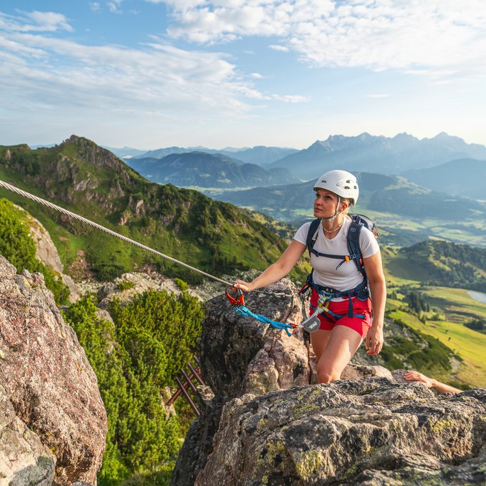 From the Lärchfilzkogel top station, trail no. 711 leads in the direction of Wildalmen and then downhill to the Grießenbodenalm. From there, follow trail no. 18 uphill to the start of the “Himmel & Henne” via ferrata. The walk to the start takes around 1.5 hours.